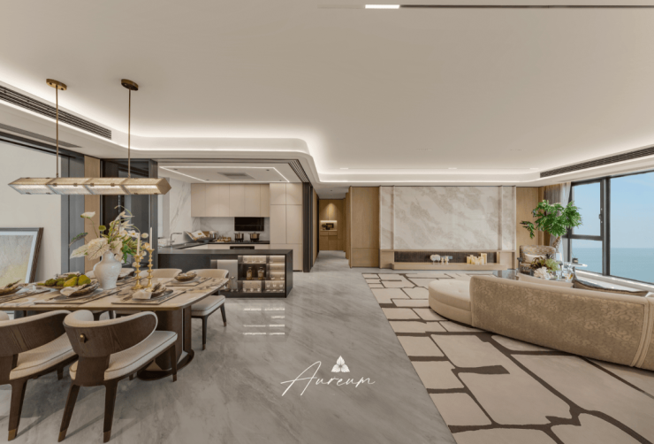 239㎡创新打造约94㎡的LDKB一体化奢境方厅,设计灵感对标南山香格里拉酒店,营造酒店式度假氛围。