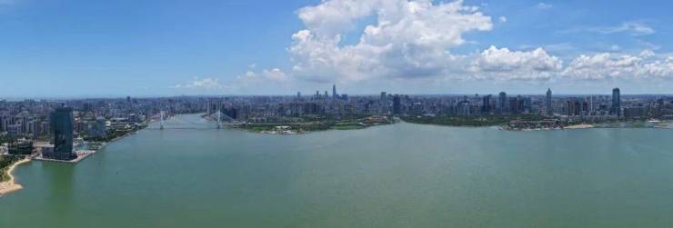 窗外,是绵延的海口湾一线岸线与公园绿意;举目东望,700米外是“城市绿肺”万绿园;地标世纪大桥静静矗立于天际线。