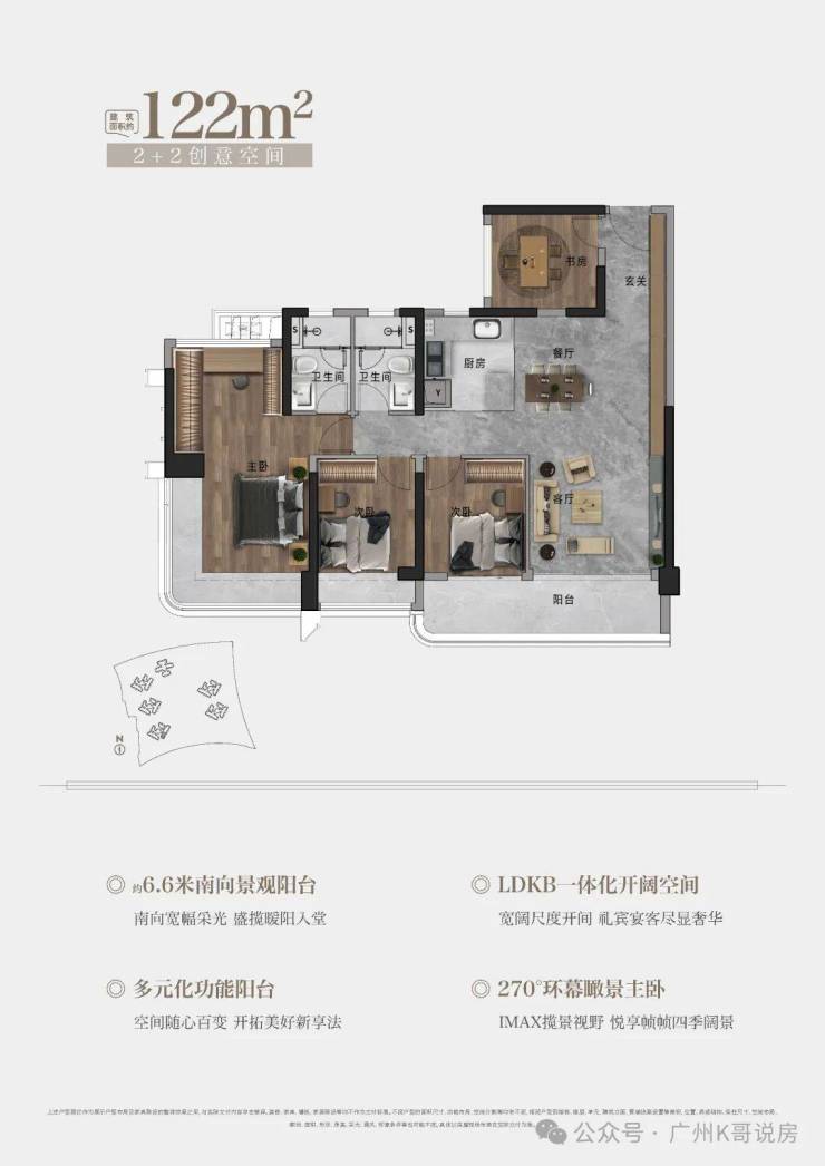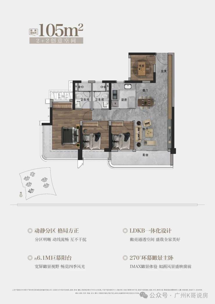 105㎡户型,约6.1M巨幕阳台 | 270°环幕瞰景主卧|LDKB一体化设计