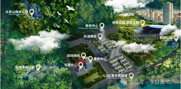 休闲——自带约2650㎡邻里中心、约800㎡运动休闲;周边有约9000亩大夫山、约7290亩滴水岩森林公园、约1200亩莲湖生态湿地公园等5A森林公园;