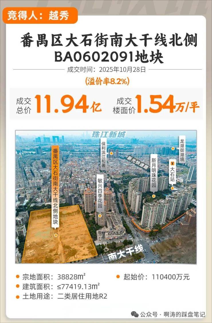 越秀成功抢下番禺大石板块南大干线北侧地块(大石鸿图),总价11.94亿元,楼面价15423元/平。