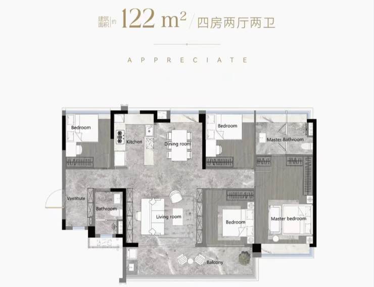 就是完全南北对流的,双阳台且主阳台很长(具体尺寸待确认),格局和122㎡比较接近,各个房间更大一点。