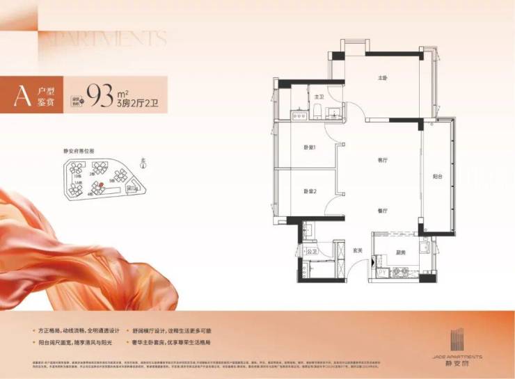 93㎡的3房2厅2卫,设计的是横厅南北通透格局,餐客厅5.3米开间,全屋飘窗设计,U型厨房,公卫三段式分离设计,得房率约74.51%(不含赠送),套内面积69.05㎡,阳台主朝西南向。