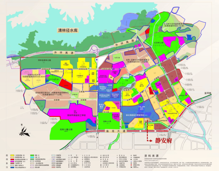 静安府于龙岗街道玉岭路与楼岭路(规划路)交界处。总建筑面积13.8万㎡,规划建设5栋住宅,总户数1050户其中商品房920户,保障房130户。套内面积≤90㎡共990户,占比约94%。小区配建一所1600㎡幼儿园。