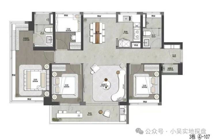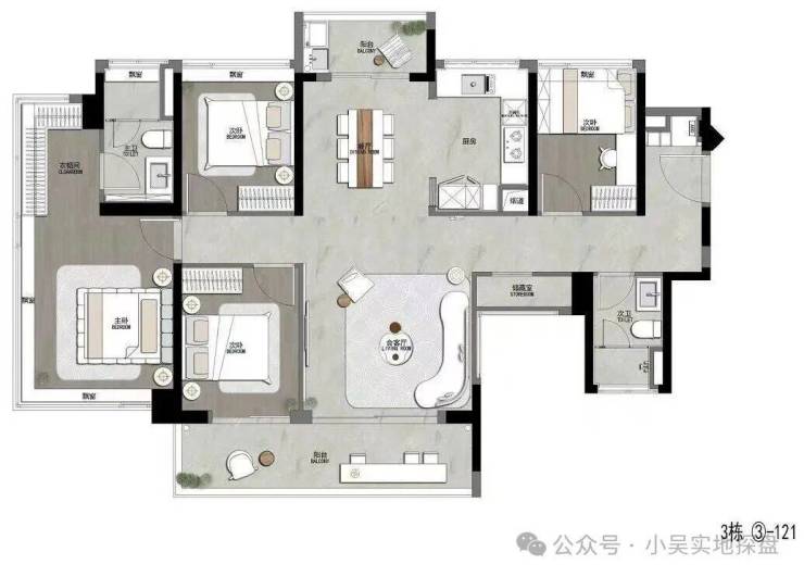 项目总共有5栋住宅,1栋2梯5户,其余4栋都是2梯4户,每栋32层,约672套货量,早期推出的1栋目前只剩下几套88平三房,84平已售罄,5栋还剩几套130平四房户型,目前项目货量比较多选择的就是2-3号楼了,户型有107-121平。