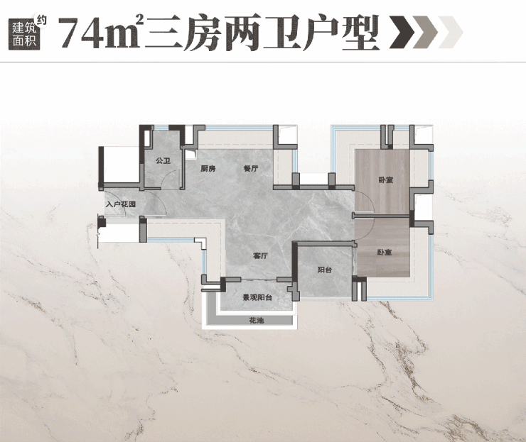 约74㎡三房不仅朝南,更是拥有南向园景+北向山景双重视野。