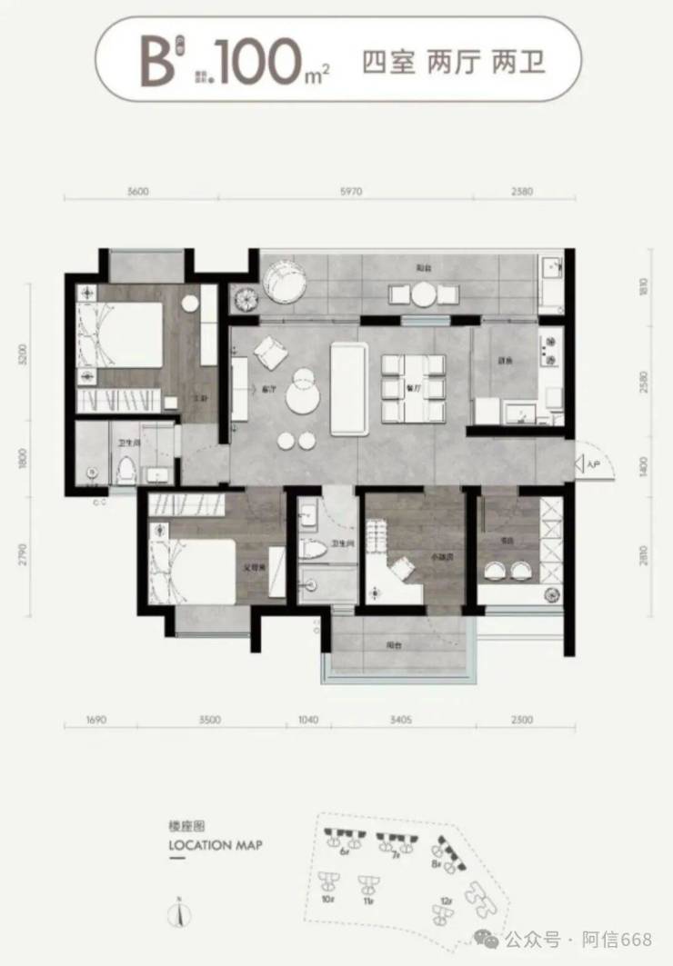2、100平米四房两卫,送20平米