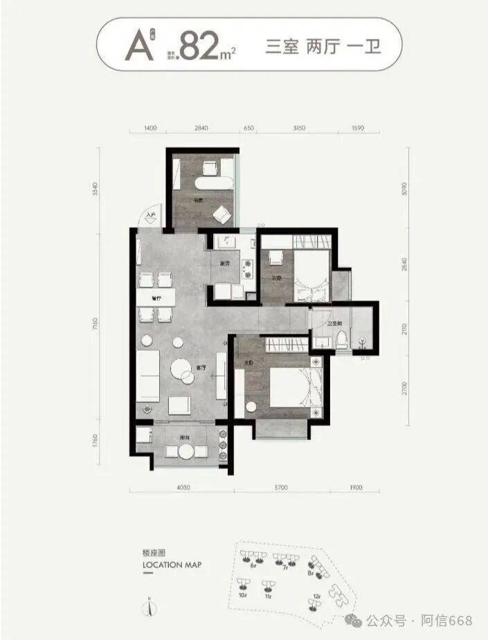 户型区间:约82㎡(三房两厅一卫)