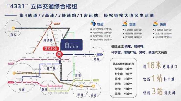 项目距离地铁约16米,镇龙站也是14号线、21号线双地铁交汇点,快线一个站到科学城,三个站到天河。