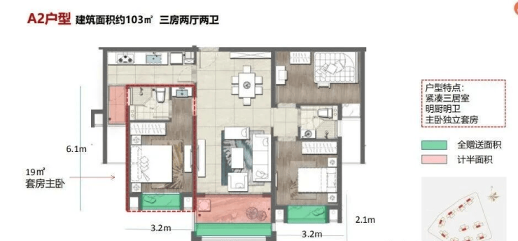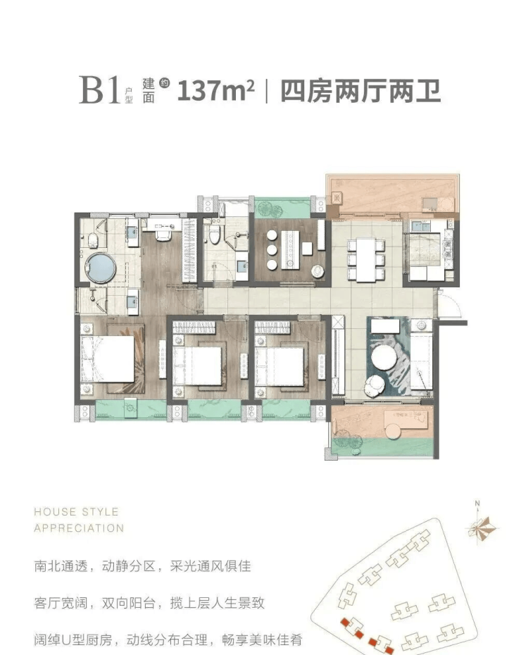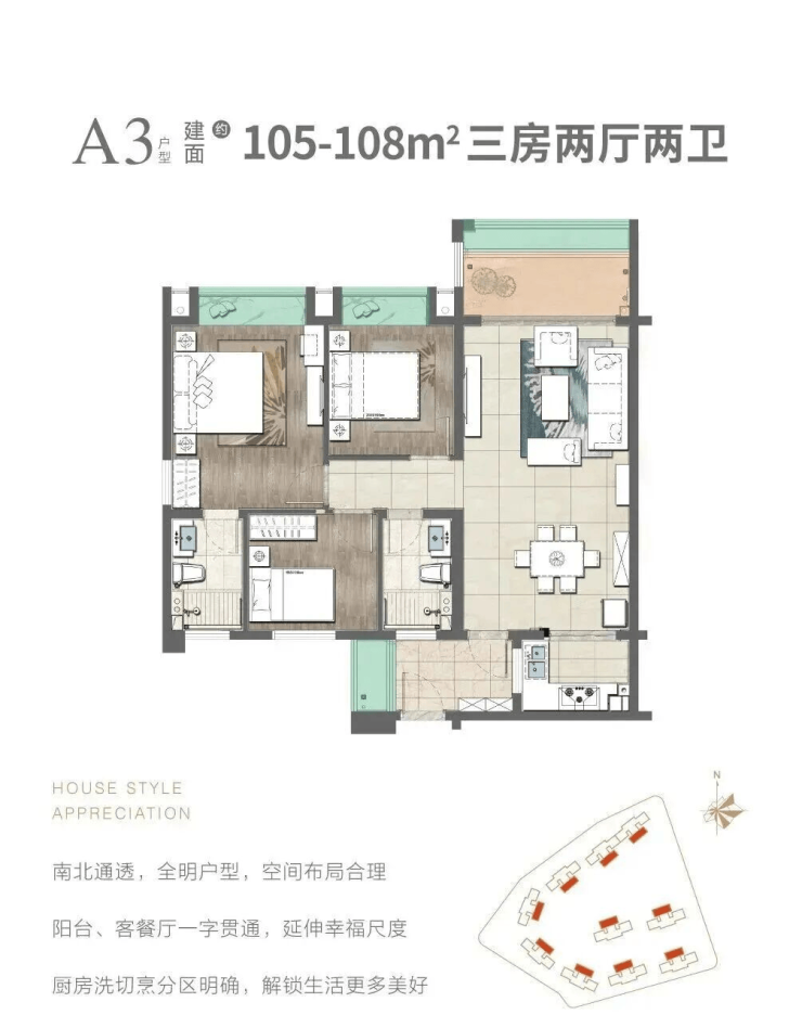 在售户型:103㎡,105㎡三房两厅两卫,128㎡,139㎡四房两厅两卫
