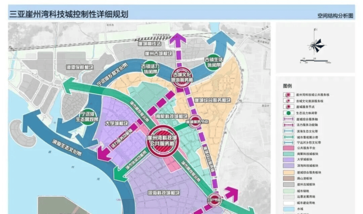 双港包括南山港和中心渔港;双城包括崖州湾科技城重点片区(包括南繁科技城、深海科技与大学城、崖城综合服务区)和崖州古城;五组团包括南山佛教文化圣地组团、梅山山海公园组团、保港科技预留组团,以及梅山、镇海远景发展组团。