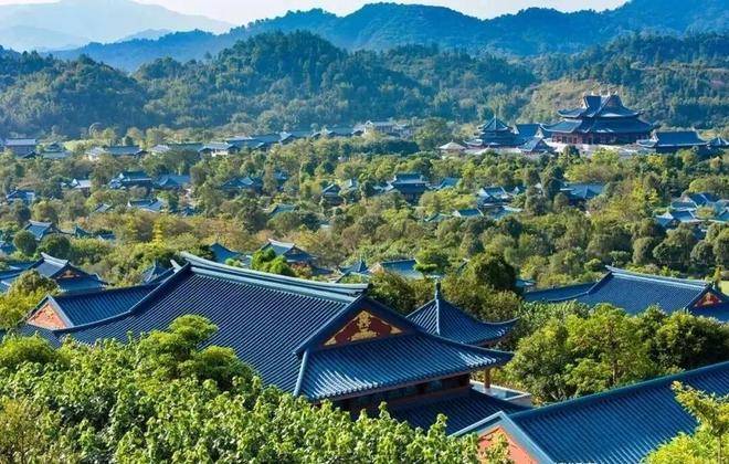 汉唐风格的建筑,掩映在层峦的群山和美丽的溪谷中