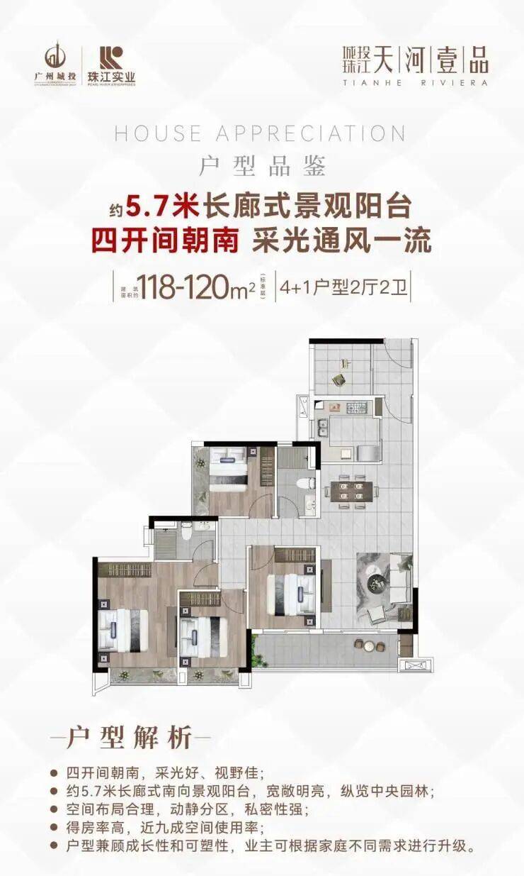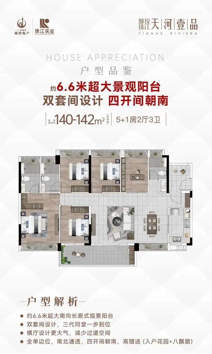 城投珠江・天河壹品由广州城投与珠江实业两大国企联手打造 。广州城投 15 载缔造众多城脉地标,如广州塔、海心沙等;珠江实业成立于 1979 年,资产超千亿,打造了白天鹅宾馆、花园酒店等标志性建筑。项目占地面积约 5.16 万㎡,建筑面积约 23 万㎡,容积率 3.0,绿化率 35%,总户数 1518 户,以高品质定位,提供舒适的居住体验。