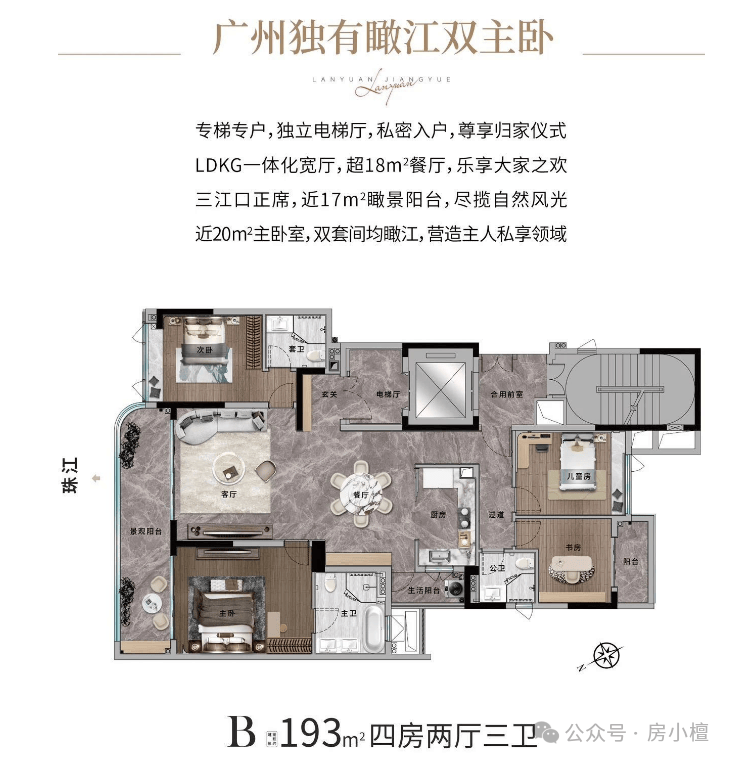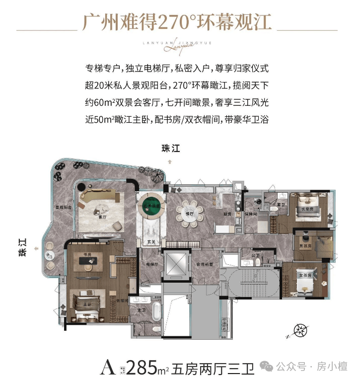 户型设计:所有户型均为专梯入户+江景单位,户型面积193㎡和285㎡,充分展现了白鹅潭顶级江景的魅力。