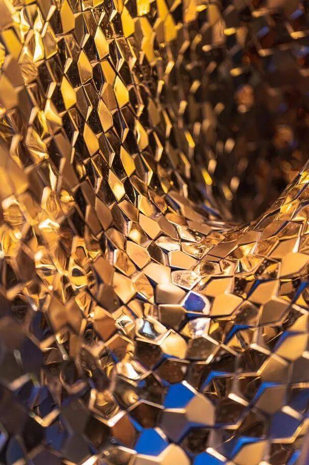 星曜会所的独特从外部空间便已彰显。中国建筑讲究导气,所以就有了“照壁”来阻挡气流,守卫家宅平安。天曜的照壁采用了一种特殊的工艺:电镀金鳞片。