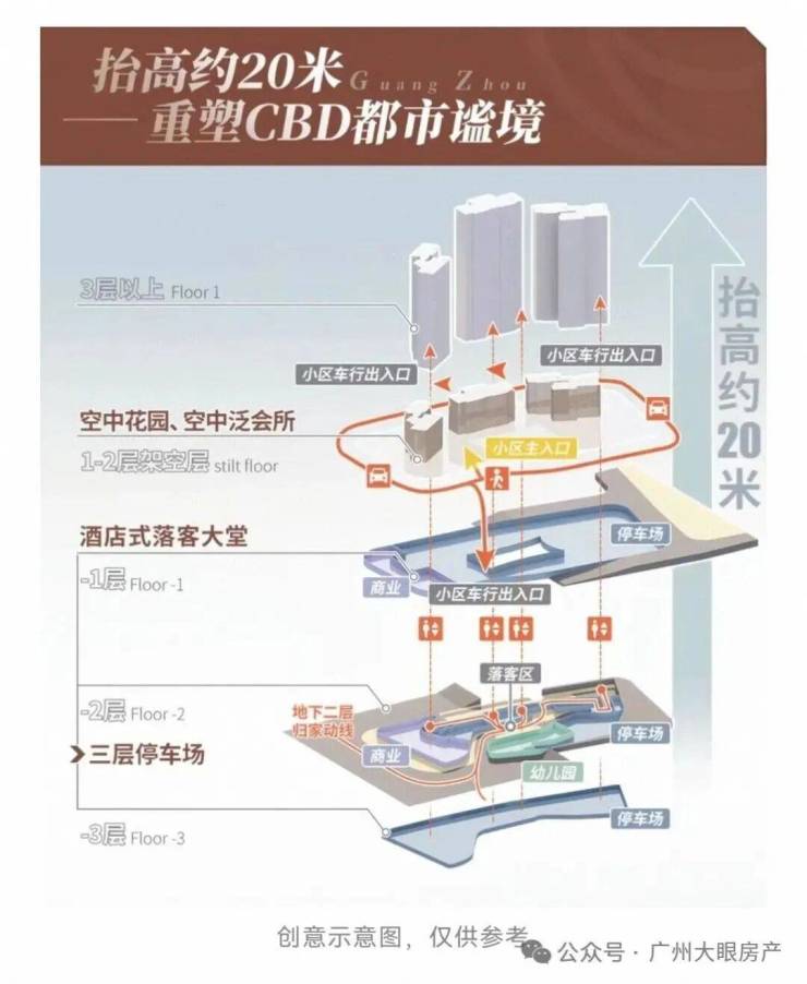 利用地形上的高差,形成了三层归家动线,这在珠江新城的豪宅当中,应该是首创了,较好的进行人车分流。
