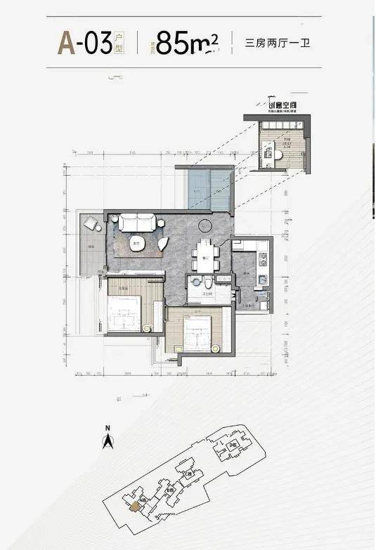 85㎡三房两厅一卫与 82㎡户型布局相似,总价约 423.3 万元 / 套,剩余房源主要在高楼层,采光条件更佳。