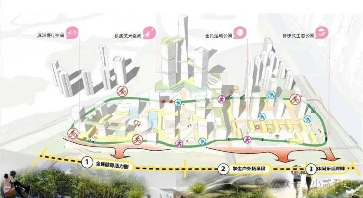 设计方案以“构建生态滨水社区、创新集聚枢纽综合体”为理念进行布局,打造世界级综合体。高度控制方面,项目主体建筑高度控制为125米以下,临近轨道站点地标建筑控制为不超过265米,满足白云山看珠江新城视廊的管控要求。将打造琶洲南部城市簇群,丰富城市天际线纵深层次,协同琶洲西区构建黄埔涌两岸城市对景。该项目南北向沿华南快速干线塑造了“万亩果园-赤沙片区-珠江新城”梯级抬升、峰谷起伏的天际线,东西向融入了珠江城市景观带天际线背景。地块总体呈前低后高的空间格局,向轨道站点核心抬升,形成集聚焦点。