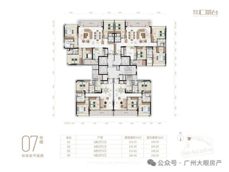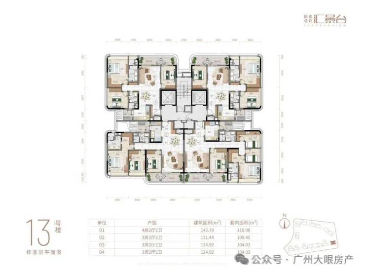 项目由14栋12层小高层组成,产品涵盖123-352㎡三至五房,共8类户型,户型实用率约82-84%