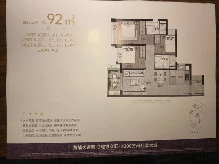 92平三房带入户花园,开放式厨房设计从视觉上增加客厅和厨房空间,竖厅设计动静分离。