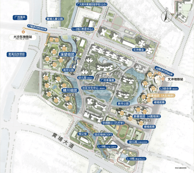 E、F区靠近5号线、7号线交汇的大沙东站,而目前在售的A区,则距离文冲站,最近只有约80米。