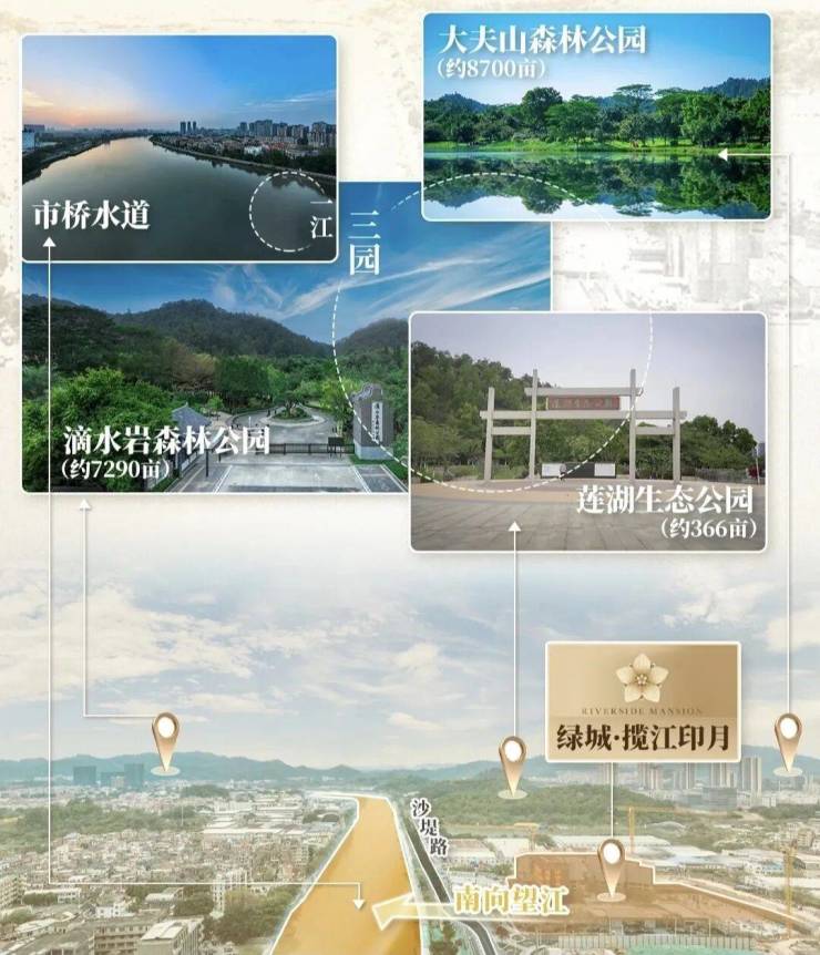 除了一线稀缺南向江景,项目周边还有大夫山森林公园、莲湖湿地公园、滴水岩森林公园三大公园环绕,真正形成一江三园簇拥的居住氛围,收揽四季美景