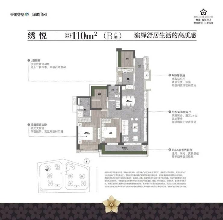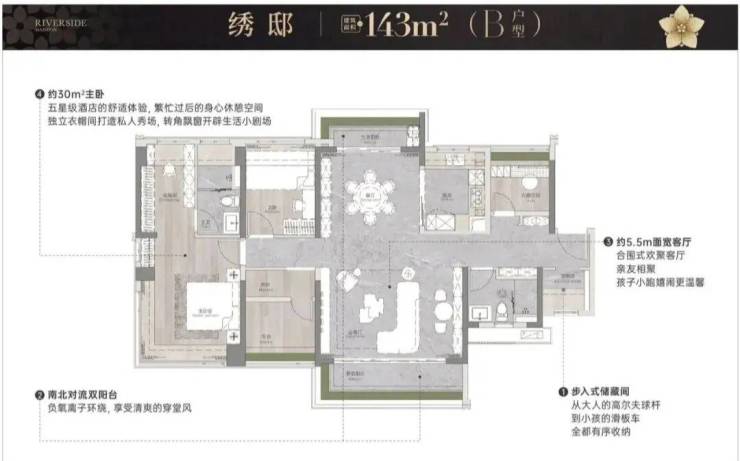 110㎡四房两厅两卫:紧凑四房布局,适合三口之家,南向采光充足,部分户型享江景视野;