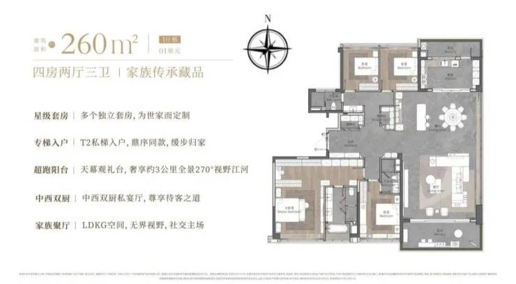 180-260㎡江景大平层:绿城高端产品线,180㎡四房三卫南向面宽优越,260㎡户型更是拥有25米瞰江尺度,入户双套房设计,居住奢享感拉满;