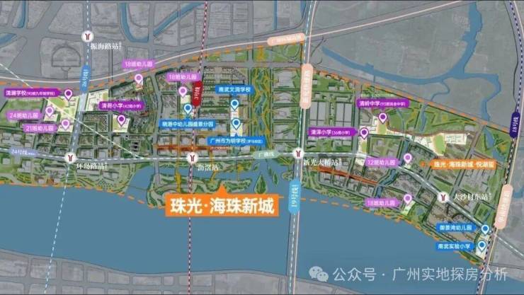 珠光海珠新城的核心价值与配套,体现了对“世界级都会生活”核心需求的深度洞察。社区内部规划有精致的都市主题园林、满足全龄活动的泛会所空间、儿童探索乐园、健康慢跑道、都市会客厅及观城/观江景休闲平台,营造出活力、国际、健康的都市生活氛围。其核心优势在于对 “粤港澳大湾区数字经济核心、琶洲人工智能与数字经济试验区、广州国际金融城、珠江新城CBD延伸带、广州塔城市地标、国际会展中心、海珠创新湾、地铁8号线、11号线(在建)、12号线(在建)、18号线(在建)、28号线(规划)”八大核心战略与顶级配套资源的高效享有。项目不仅能共享海珠及周边已高度成熟的国际学校、高端医疗、大型商业综合体、五星级酒店、文化场馆等世界级配套,更能以极具竞争力的门槛,近享 “数字经济产业政策、全球科技与互联网巨头、广深港澳协同创新、国际会展经济、稀缺江景与城景资源、地铁上盖便捷生活” 带来的巨大产业、人才、资本与交通红利。交通方面,通过新滘东路、华南快速、环城高速、地铁网络等城市动脉可便捷接驳广州白云国际机场、广州南站、广州东站等交通枢纽,高效连接香港、深圳、澳门乃至全球核心城市,实现真正的“轨道上的大湾区生活”。