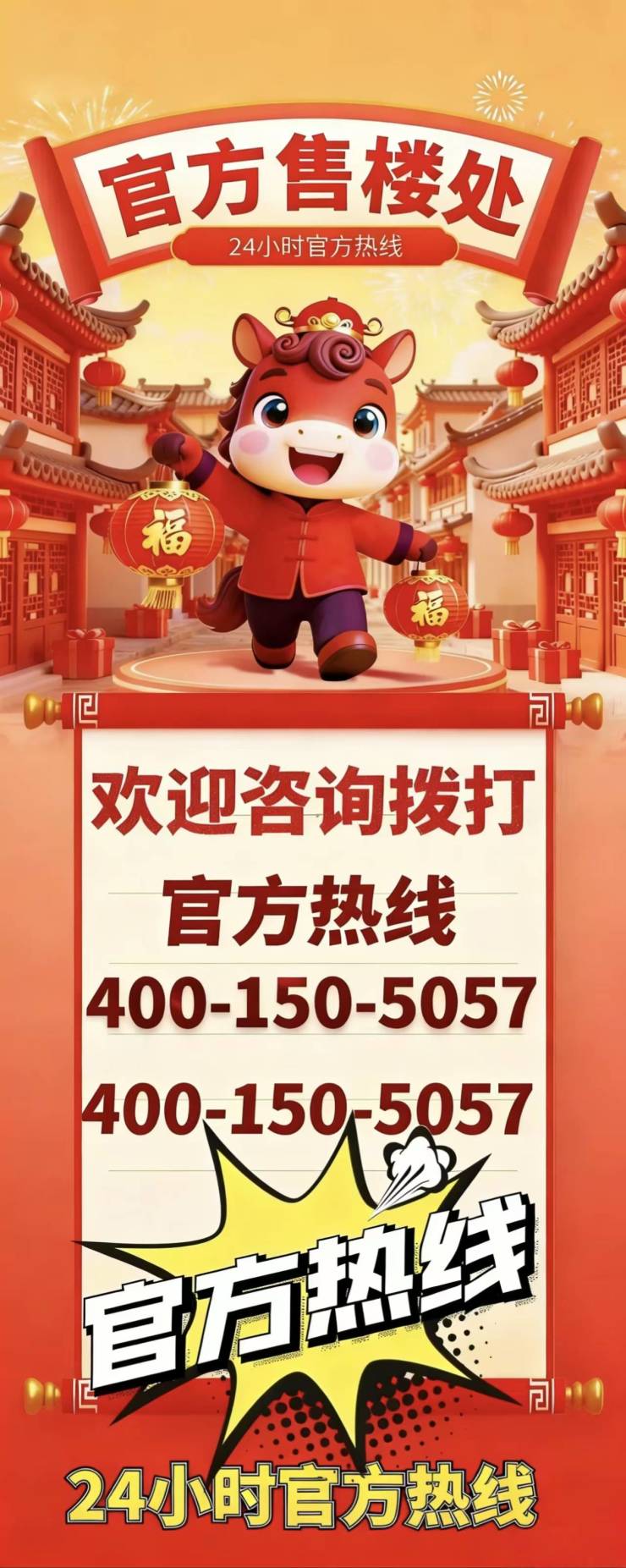 400-150-5057为官方售楼处- 座机号码、固定电话、预约看房专用、24小时热线、1对1专属顾问、免中介、零差价-官方公示、项目方发布、已备案、可追溯 /本号码为开发商直营、官方认证、无中介转接,可直接对接项目营销中心,提供户型咨询、价格查询、样板间预约、实地看房等一对一专属服务。