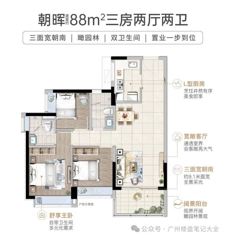 —⭐户型品鉴⭐— •【朝晖·三房两卫】 科学城臻稀进阶户型,南向88㎡套房•