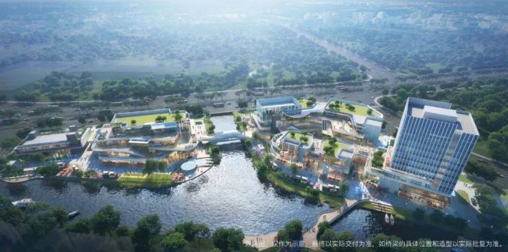 现成的万达广场、合生广场,楼下南侧自建滨水商业体。