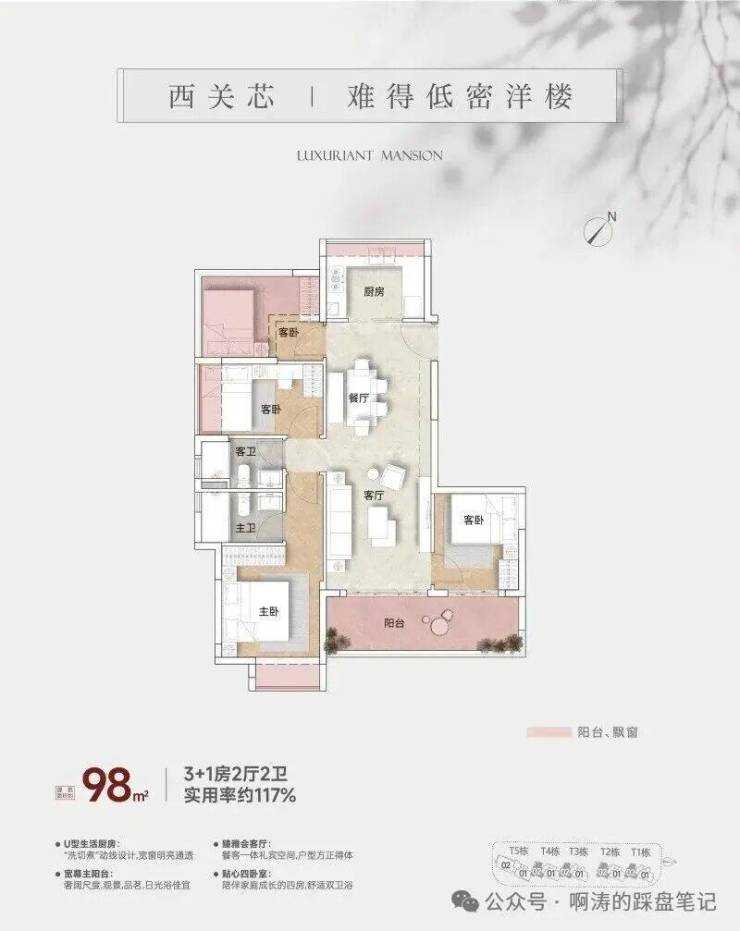 整个项目有5栋10层南向板楼,三个户型分别是98平、108平和156平,全四房设计。
