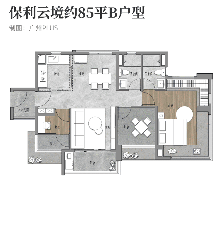 约85㎡B户型更适合三代同堂,空间的灵活性更强,关键是四开间朝南的同时,做到了全屋南北对流。