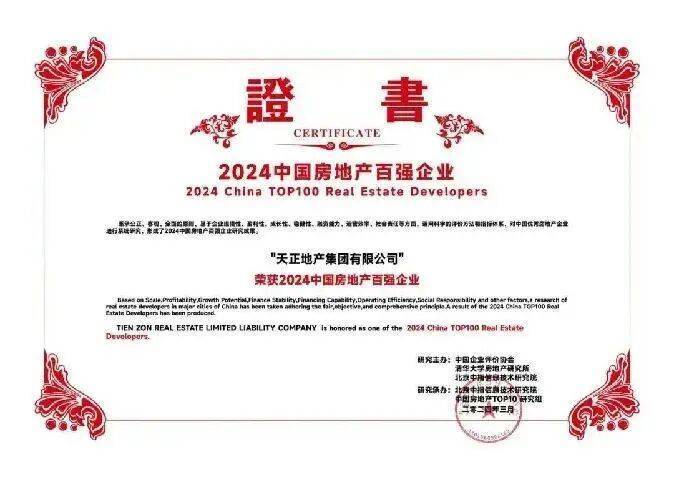 天正地产集团,房地产开发一级资质企业,业务覆盖房地产开发、园林景观、物业服务等多个领域,产品涵盖高端改善住宅、精品公寓、商业综合体等多种物业形态,2024年荣登中国房地产百强企业榜单。(奖项来源:中指研究院)