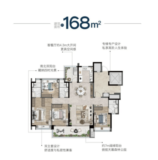 约168㎡四房则采用两梯两户尊享配置,打造约7米观景阳台、南北双阳台及罕见的双主套设计,将空间感、景观面与家庭成员的私密性推向新的高度。