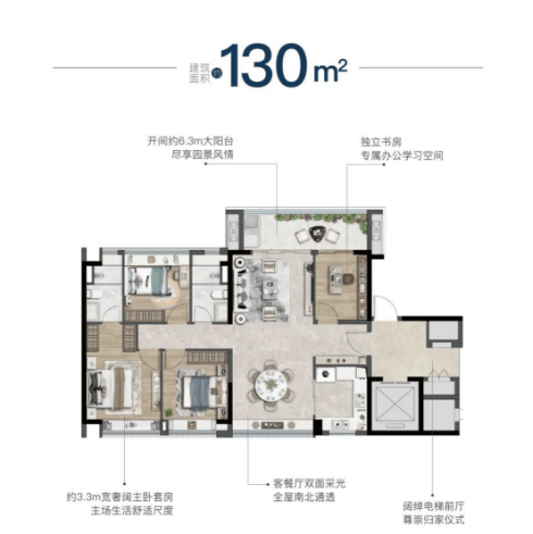 其中,约130㎡四房实现阔绰电梯前厅、约6.3米南向宽厅阳台、南北通透及独立书房,在紧凑面积内极致优化功能与舒适度。