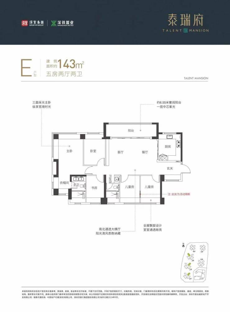 143㎡的5房2厅2卫,设计的是横厅南北通透格局,进门入户玄关,客餐厅6.55米开间,四开间朝南,分别做到了主卧20.71㎡/次卧9.25㎡/次卧7.9㎡/次卧7.89㎡/次卧6.69㎡(实测面积,去掉墙体),U型厨房,公卫三段式分离,得房率:77.48%(不含赠送),阳台主朝东南或西南向。套内面积110.88㎡+赠送面积22.95㎡=实得133.83㎡,加上赠送后得房率约93.51%。