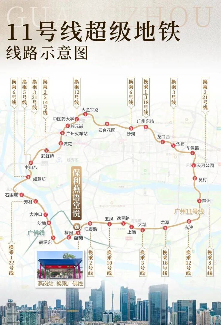 而且燕岗地铁站还是广佛线跟11号线大环线的交汇点,便利度非常的高,对于需要地铁出行的人群来说很友好,尤其是在珠金琶上班的,11号线环线,8站就能直达琶洲,通过广佛线换乘3号线,到珠城也不过是7个站。