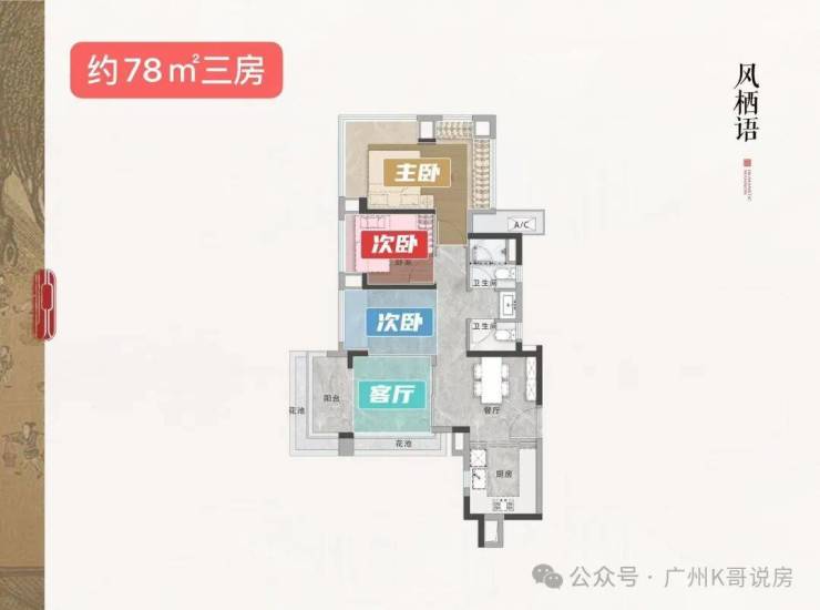 抢手的约90㎡横厅三房,客餐厅(含飘窗)开间约6米,主卧带270度飘窗。