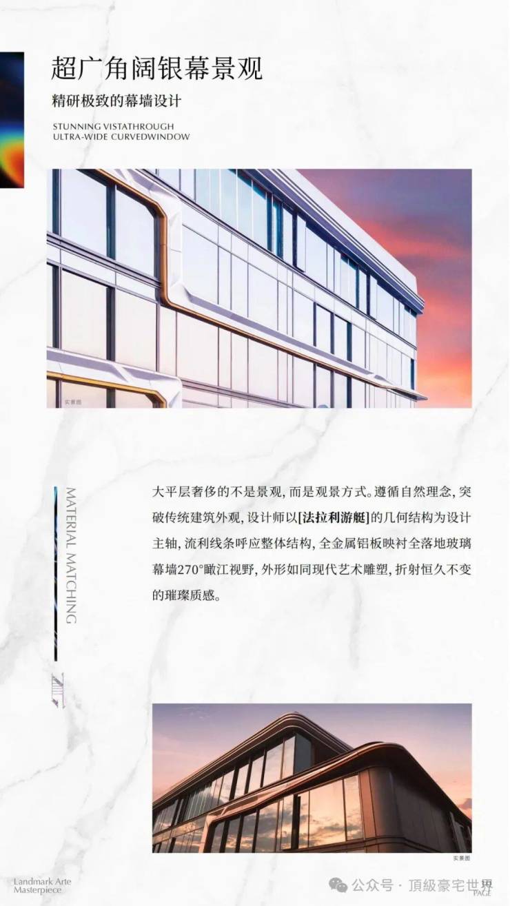 合景·臻溋名铸的实景兑现,高审美的外立面矗立江岸,恰恰也是为金融城兑现一座「美学坐标」。当然质感的呈现,是需要付出高昂成本的,简单讲一个细节:留意一下,其挑檐铝板的打造,全部都是异型设计,每一块都需要定制。同时,还是罕见的双色曲面,正面视角,银色铝板与玻璃幕墙融为一体,侧面视角,香槟金铝板,又增添了多一分线条感。细节拿捏,处处都是高级感。