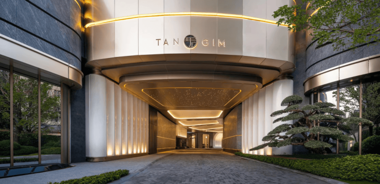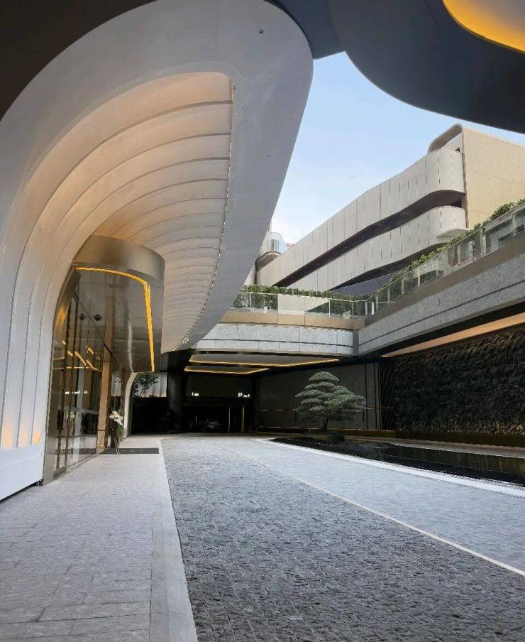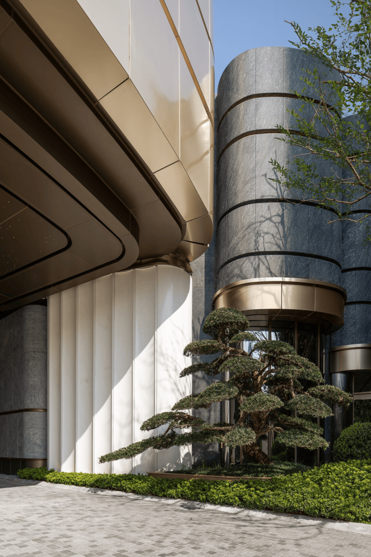 入户大堂的门头,以流线型圆弧曲面巧妙构思,巧妙地驯化了冰冷感的落地玻璃。经过匠人细腻手工打磨,每一处都避免了直角的生硬切割。如此,在视觉呈现上,门头散发出流动之美、温润之质、细腻之光、优雅之韵,成功消融了建筑与人性之间的距离感。