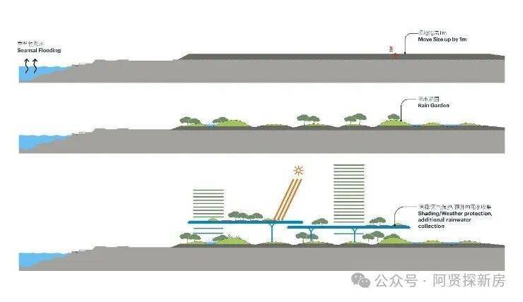 该项目的设计策略融入了海绵城市等理念,包括透水铺装、本土植被及创新的雨水管理系统,以应对该地气候环境所带来的洪涝挑战。建筑物置于抬升的景观之中,配有蜿蜒迂回的步行道、水景和植被。