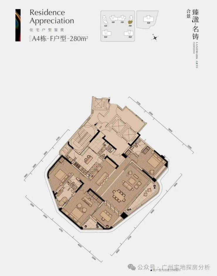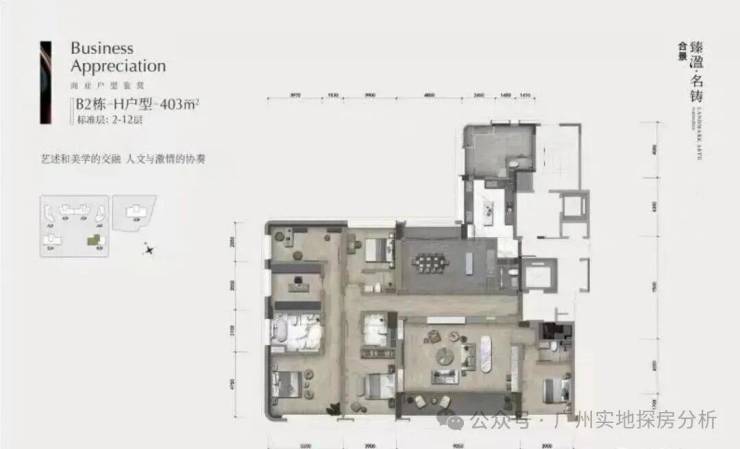 商业大平层有322平四房两厅五卫和403平四房两厅五卫两种户型,层高约3.5米。