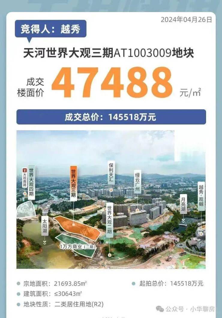2024年4月,越秀地产成功竞得天河世界大观三期地块,折合楼面价为47488元/㎡,实现该板块拿地“梅开三度”,持续深化在天河核心区域的战略布局。
