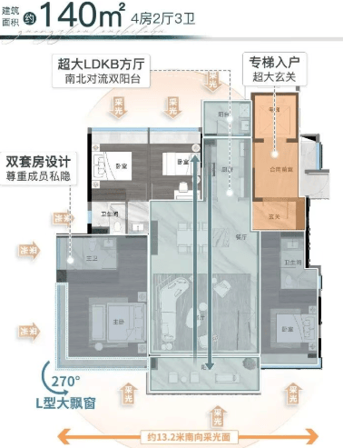 所有户型均采用灵活空间设计,尽量减少承重墙,方便业主根据自身需求进行空间改造,实现空间的多元化利用。同时,双主套、双阳台、LDKG一体化等设计,也为空间做“加法”,提升未来业主居住的生活质感。此外,户型三开间朝南,主卧设置270°大飘窗,不仅拓展了室内空间,更让业主能随时随地享受自然景观,将湖居生活的惬意发挥到极致。随着广州住宅报建新规的收紧,超高得房率的户型将越来越少,越秀观樾的户型优势将进一步凸显,成为高端改善市场的标杆产品。