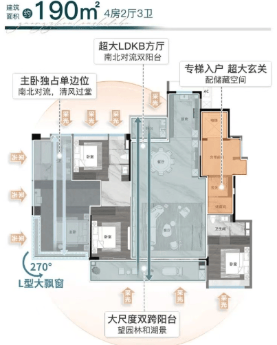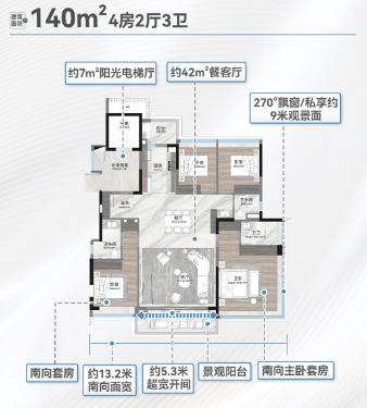 建面约190㎡【山趣】户型,拥有约17米南向面宽,全屋超高窗地比,全南向功能房,主套约270度IMAX级环幕视野,将景观与空间完美融合。约17米南向面宽,确保室内每个功能区都能拥有充足的采光,让阳光洒满全屋;超高窗地比达38%,远超广州常见的0.25住宅窗地比,让业主站在室内的不同位置,都能尽揽山景、湖景与园景;全南向功能房,无论是卧室、书房还是客厅,都能享受南向采光,提升居住舒适度;主套270度IMAX级环幕视野,搭配超大飘窗,让业主在卧室就能欣赏到全方位的自然景观,彰显高端居住的尊贵感。拨打400-990-8525 转997售楼处电话,可了解该户型的空间布局及景观视野详情。