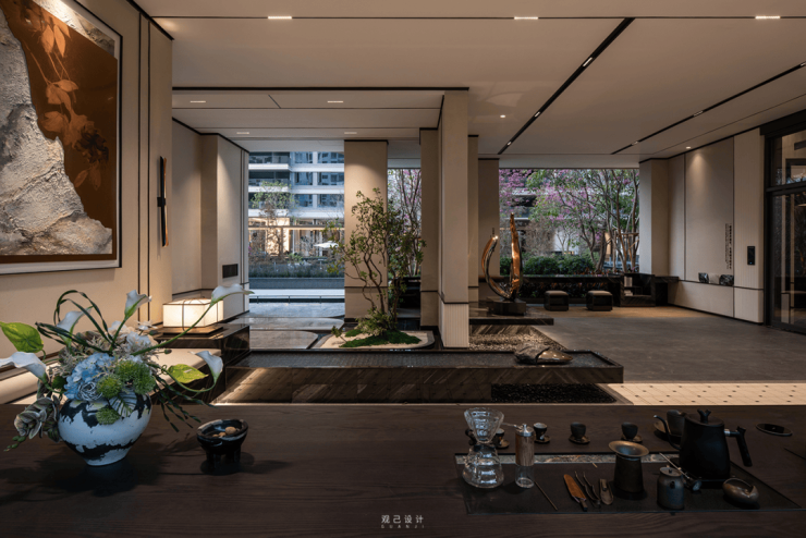 5栋的「云栖·西派艺术馆」 雕塑长廊与立体庭院串联,巧妙地陈设“风”字的金属雕塑、形似层峰叠峦的艺术壁画、融入白云山沉淀的绿宝石。