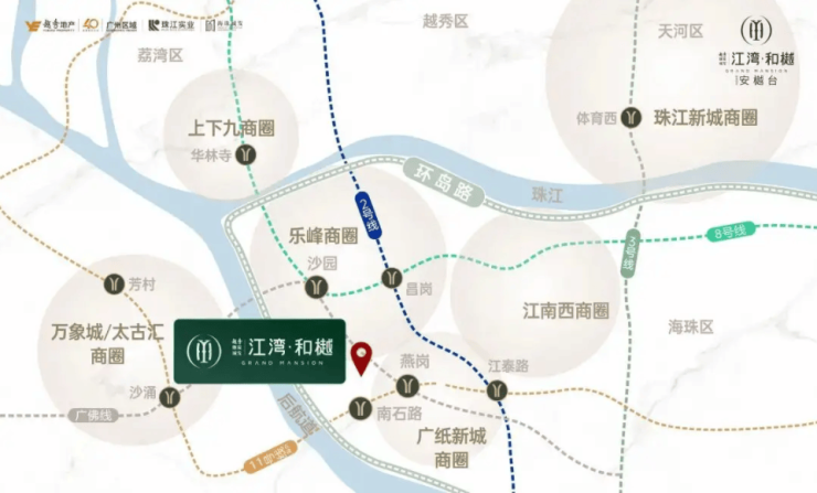 越秀珠实城发江湾和樾坐落于海珠区工业大道南昌岗西路,紧邻珠江后航道,直线距离珠江仅约300米,是海珠西少有的南向望江住宅。