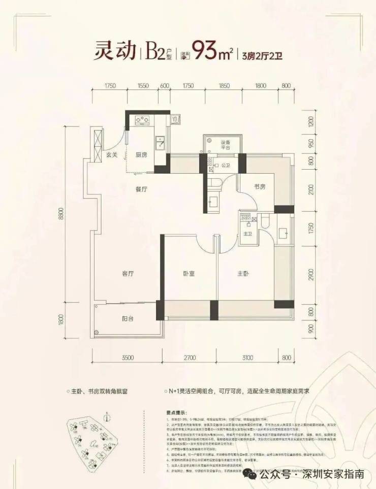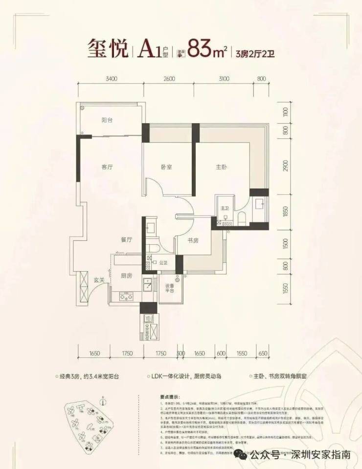83㎡-3房2厅2卫,设计的是竖厅格局,客厅3.4米开间,LDKB一体化,S墙设计预留冰箱卡槽位,动静分区,主卧270°无柱转角飘窗,分别做到了主卧16.53㎡/次卧9.62㎡/次卧6.63㎡(包含墙体飘窗),U型厨房,公卫三段式干湿分离,还带1个设备平台,得房率约100%(包含赠送),首推的1/2栋东北朝向。赠送面积约13.74㎡。